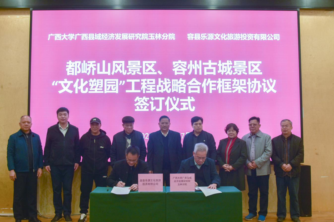 调研会上,容县乐源文化旅游投资有限公司、广西大学广西县域经济发展研究院玉林分院签订都峤山风景区、容州古城景区“文化塑园”工程战略合作框架协议,并举行“文化塑园”工程高级顾问聘任仪式。