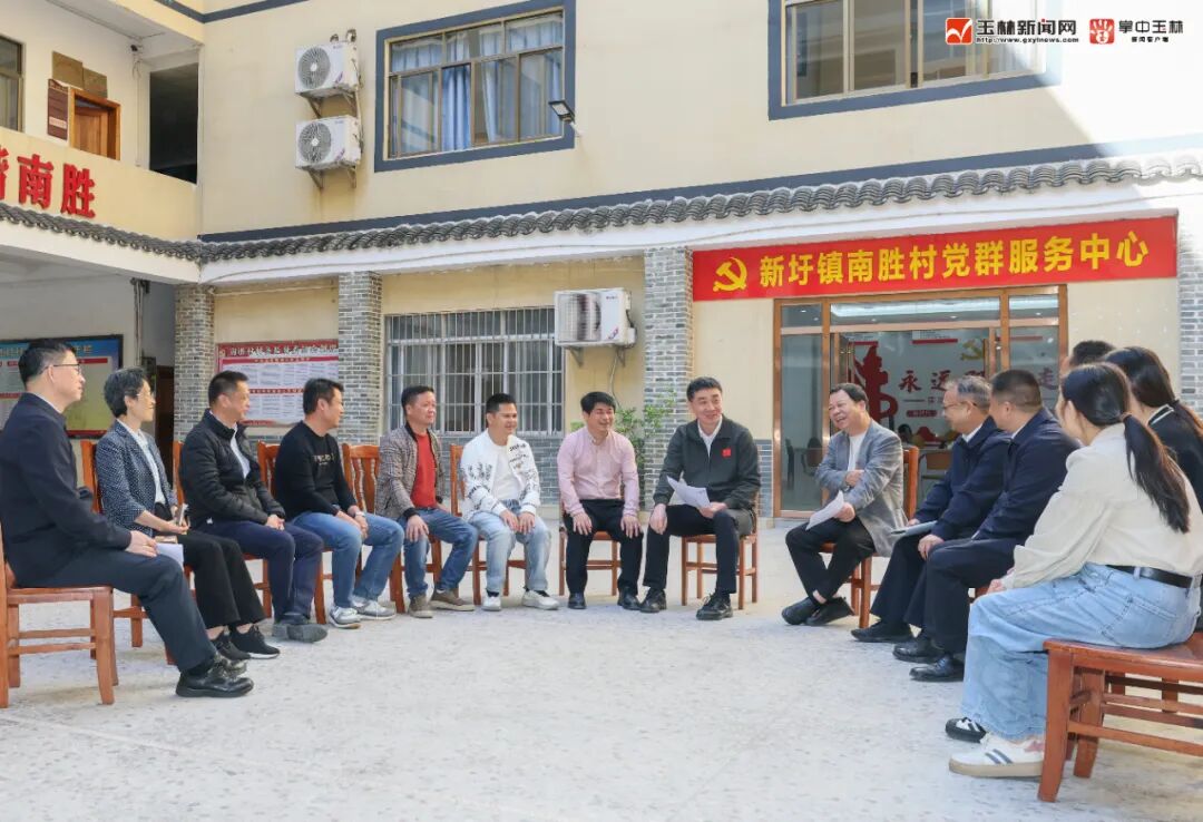 在新圩镇南胜村,王琛走进北流辉派服饰有限公司,实地察看企业生产情况,认真听取乡村产业发展、村级集体经济收入、社会治理等工作汇报。随后,王琛与基层党员干部、玉商玉工、经济能人、群众代表在村委会围坐在一起,结合当地实际和大家关心关注的问题,深入浅出地宣讲党的二十届四中全会精神。王琛指出,党的二十届四中全会是在我国以中国式现代化全面推进强国建设、民族复兴伟业的关键时期召开的一次具有里程碑意义的重要会议。全会围绕到2035年基本实现社会主义现代化的目标作出重大部署,特别是提出要全面推进乡村振兴、提升基层治理效能和扎实推进共同富裕,与广大农民对美好生活的期盼息息相关。希望大家认真学习贯彻全会精神,用勤劳双手创造更加美好的未来。广大基层党组织和党员干部要带头学习宣传贯彻全会精神,推动全会精神进村入户、家喻户晓。北流要聚焦高质量发展,加强基层党组织建设,加快构建现代化产业体系,坚持科技创新引领,强化人才支撑,因地制宜发展新质生产力,不断壮大县域经济。